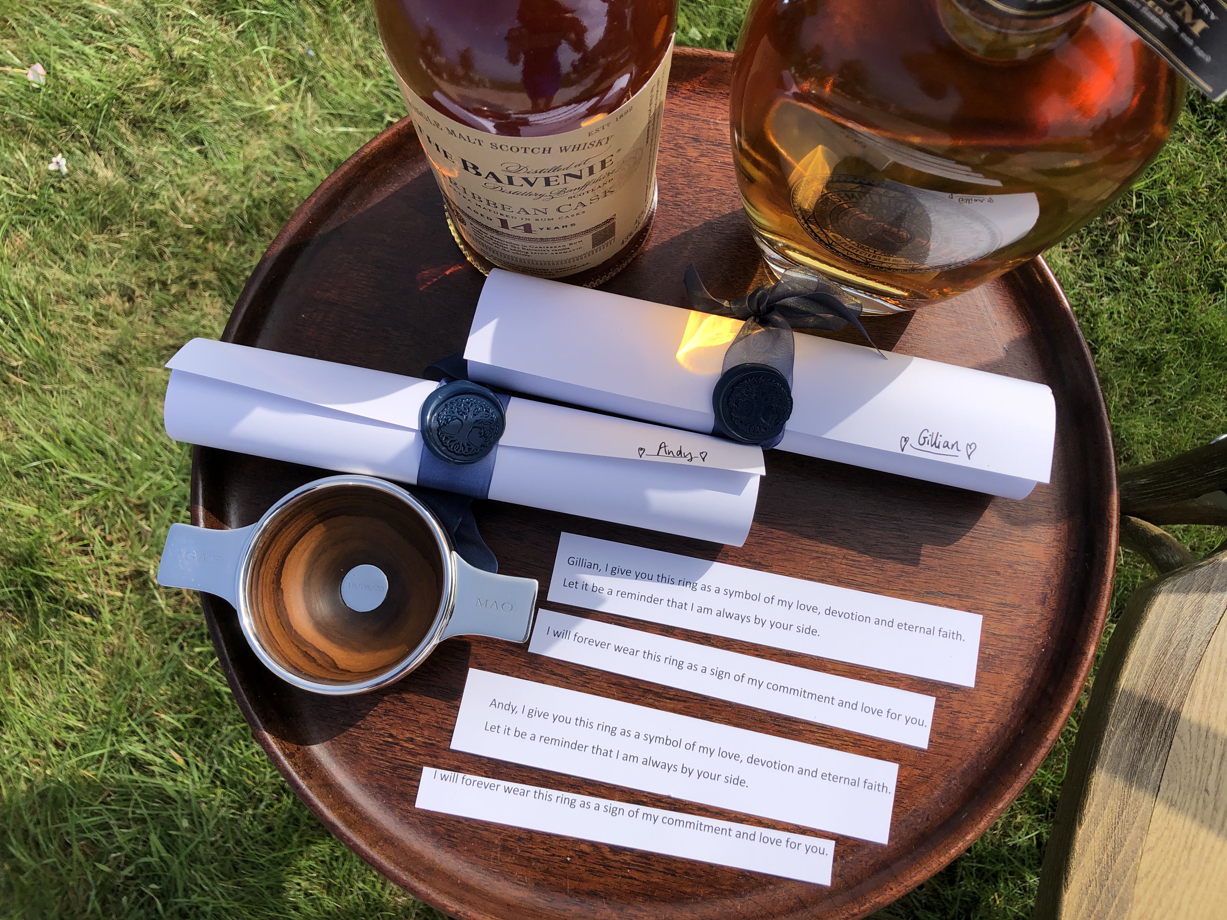 Marriage promises were sealed with a bespoke handfasting ritual, and a shared drink from a gorgeous handmade quaich. Andy chose a drop of golden Cornish rum and Gillian a drop of Scotland’s finest whisky – a potent mix to honour their shared heritage – the perfect first toast as husband and wife.