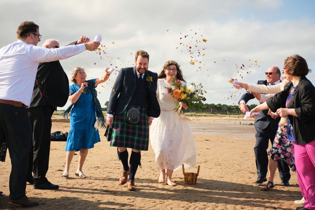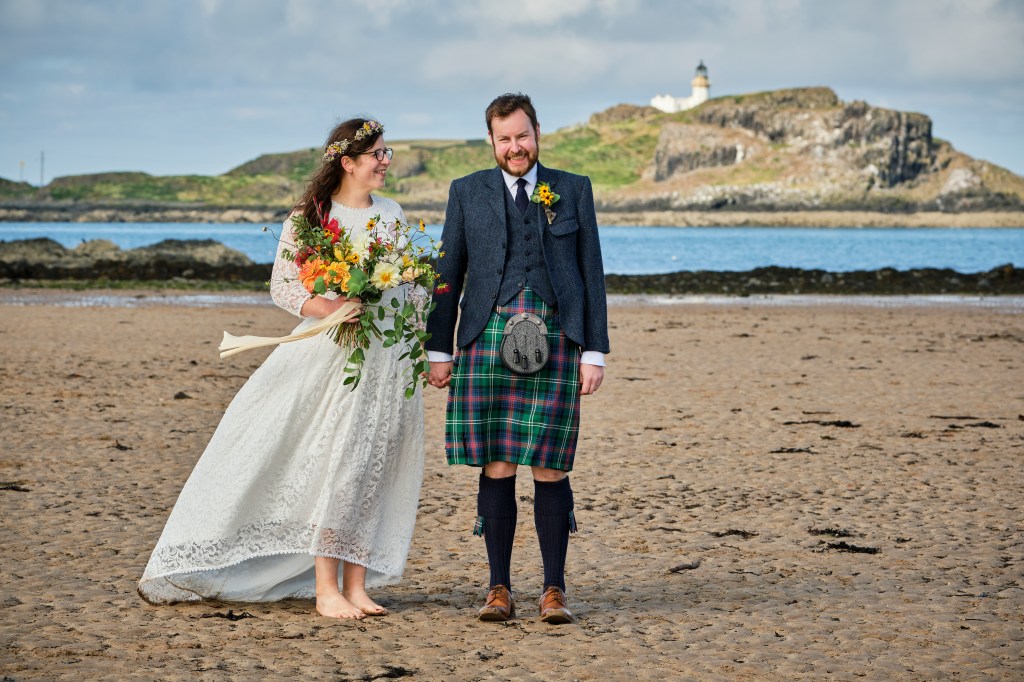 Gorgeous fun at Yellowcraig Beach in East Lothian. Nicholas and Catherine exchanged vows and rings overlooking Fidra Lighthouse and the Bass Rock with their close family as their witnesses. It was the perfect place for these two individuals who have a passion for nature, the countryside and the coast to choose to celebrate their wedding.