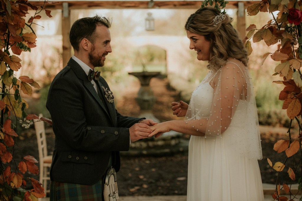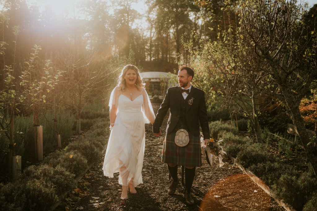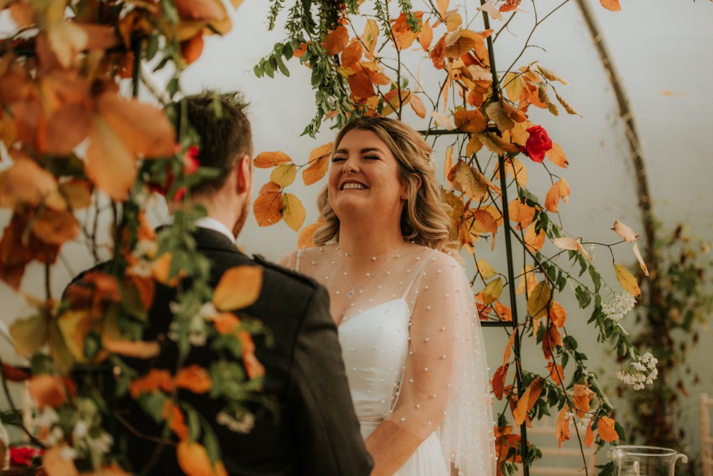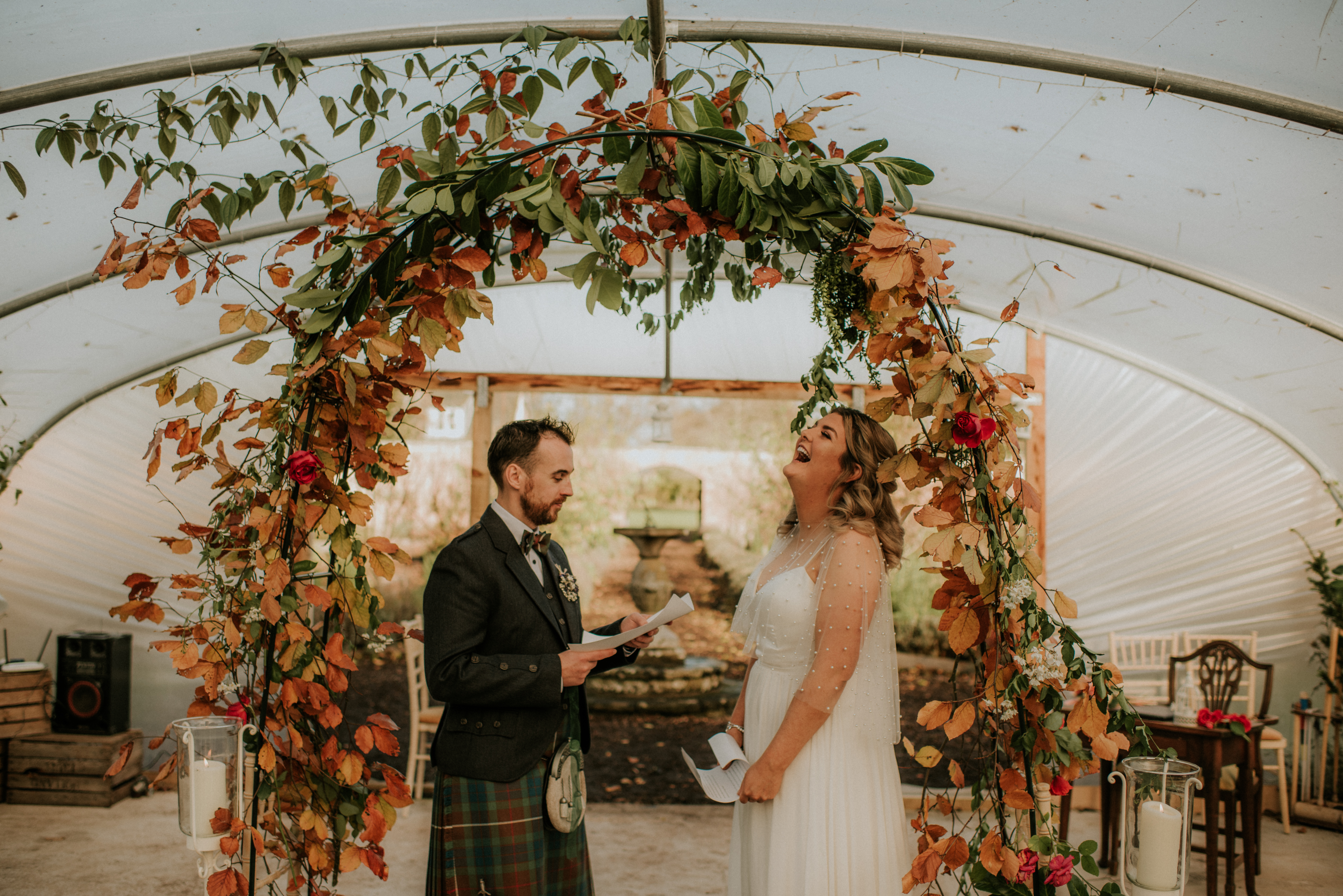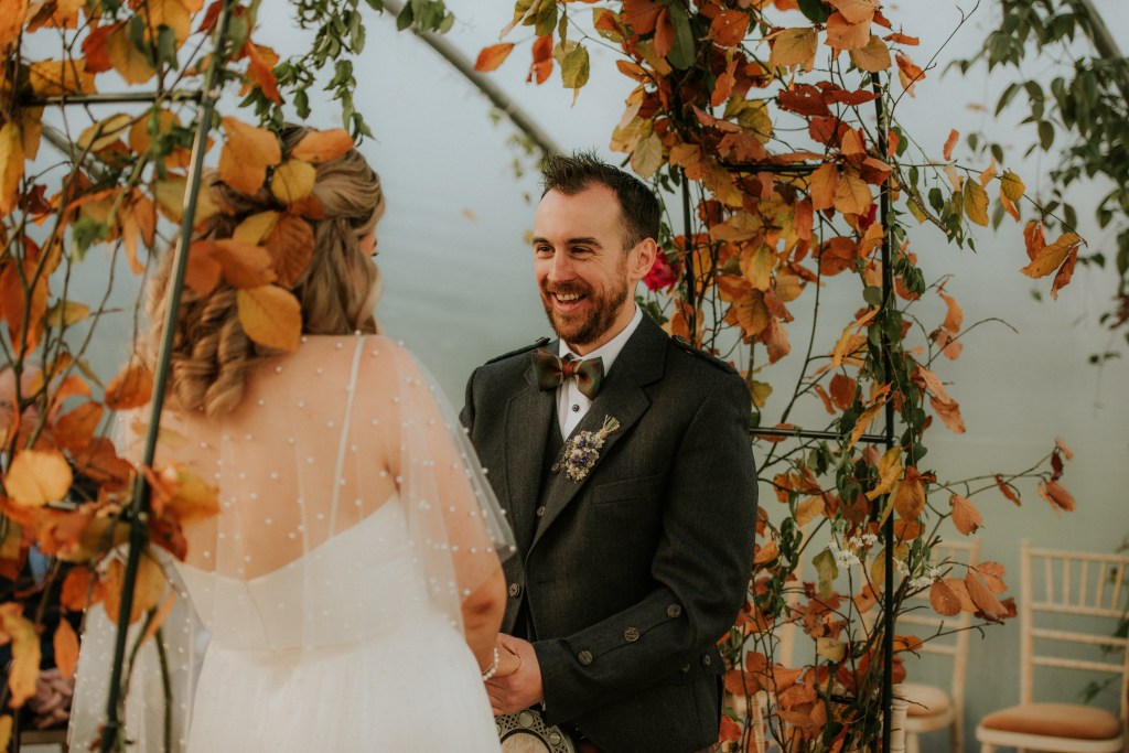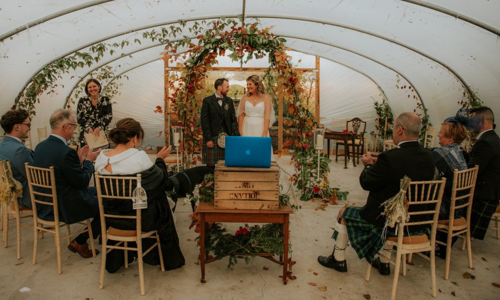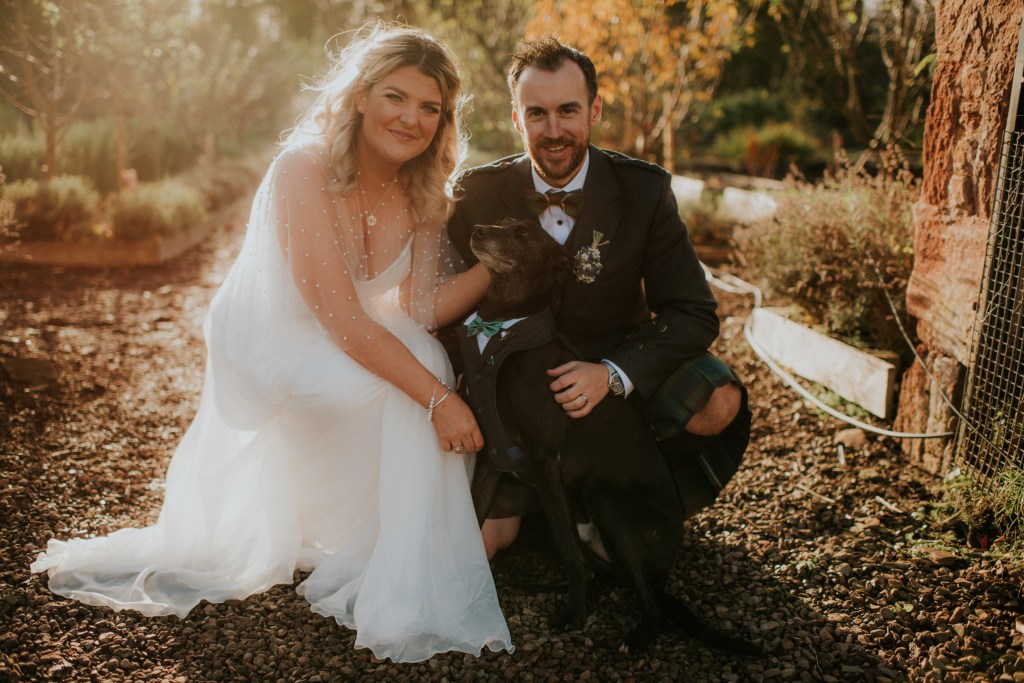 With their beautiful rescue dog, Goose, and an intimate circle of their closest family and friends, Andrew and Charlotte gathered in the gloriously autumnal Colstoun polytunnel.