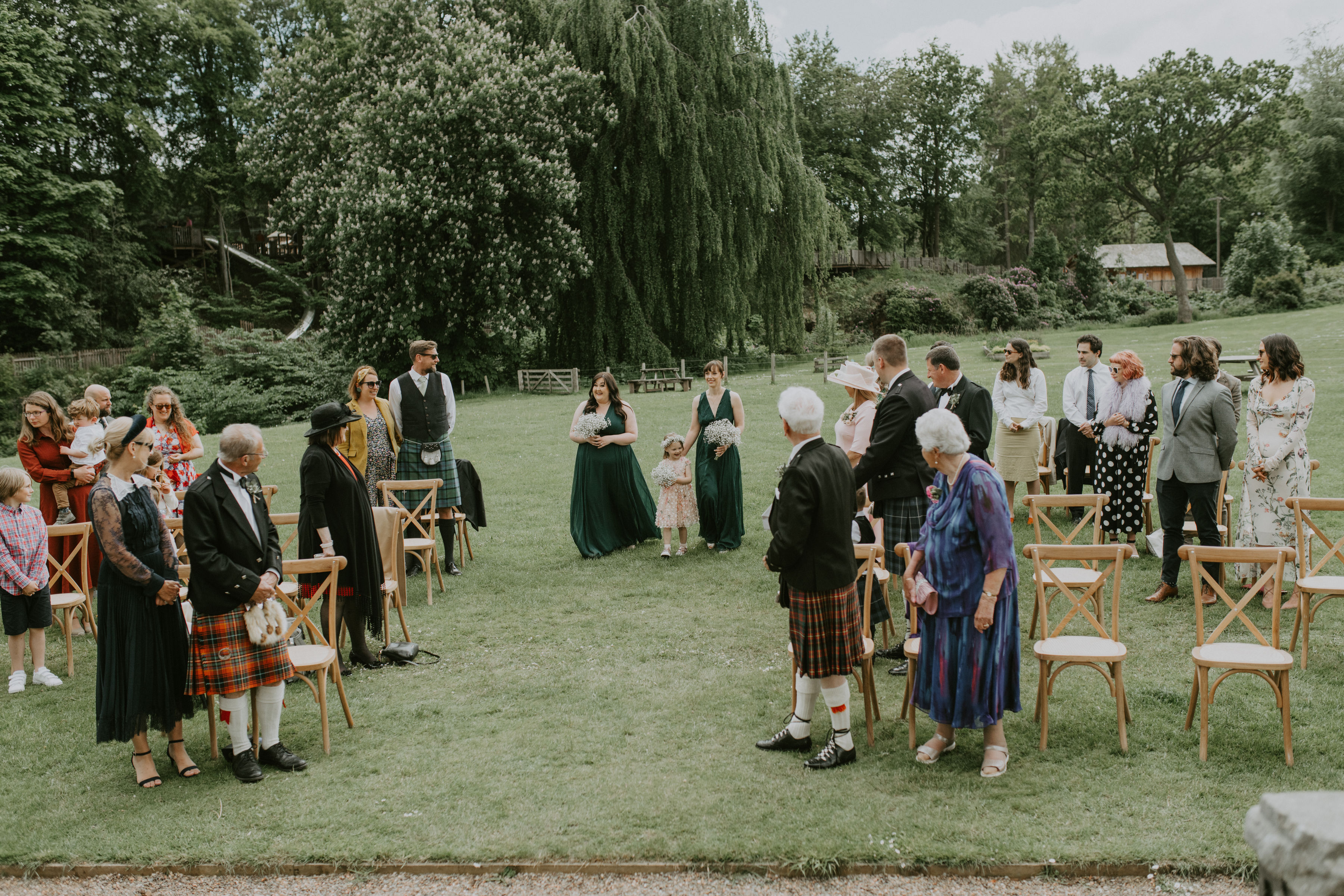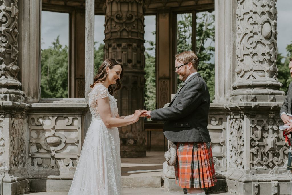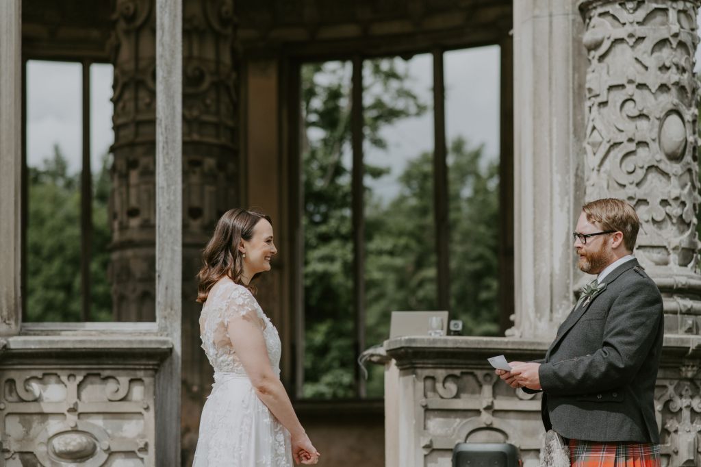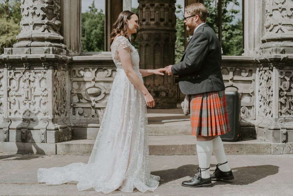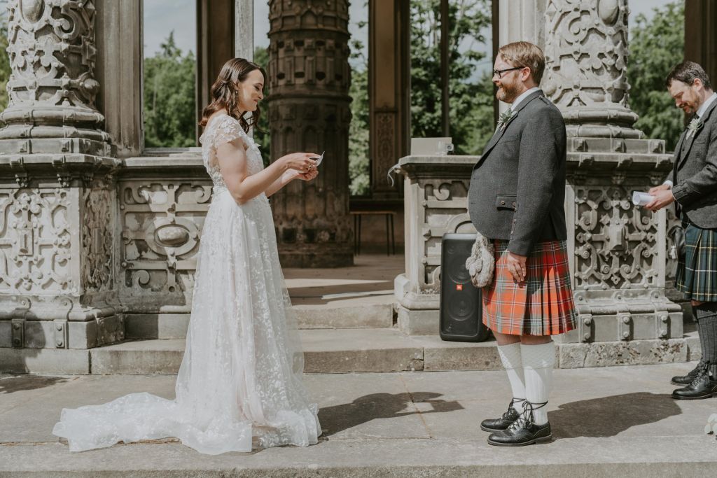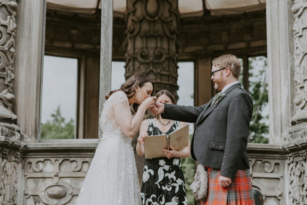Elaine and Scott wrote a secret poem for each other, which they shared on the day. Then they exchanged rings that they had made themselves, after panning for gold in the Scottish Highlands!