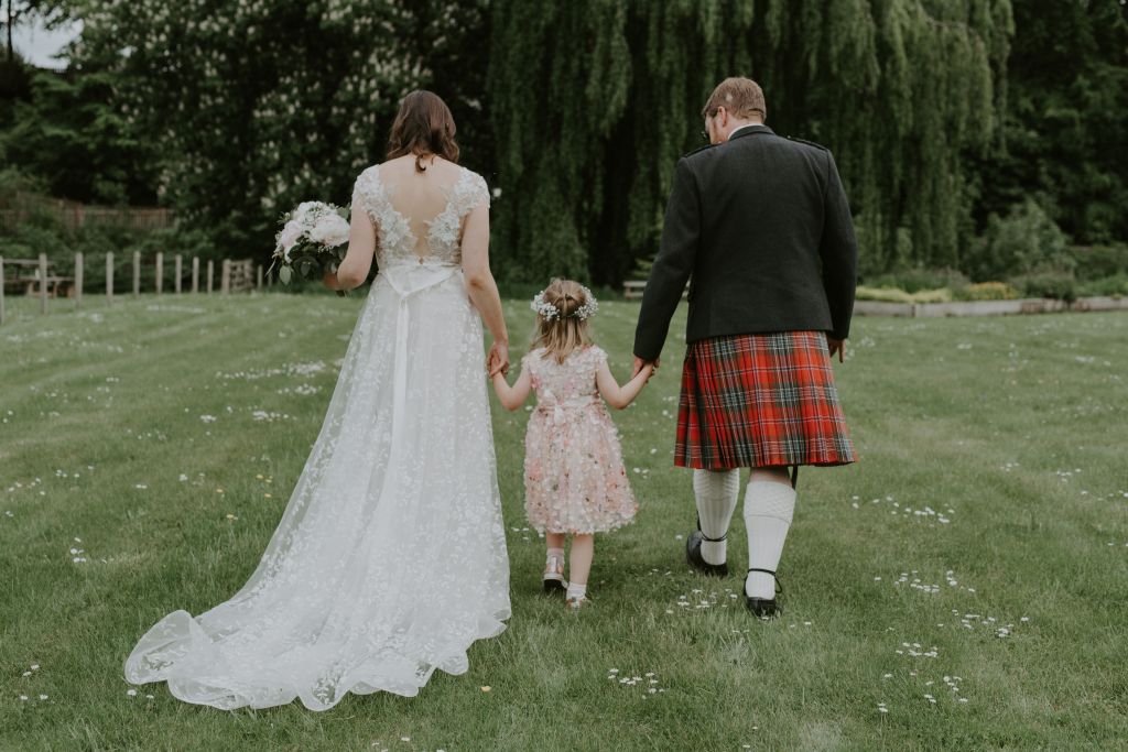 Elaine and Scott’s wedding at the beautiful Restoration Yard in Dalkeith in June was wonderful. These two super-chilled, adventurous, whisky-loving people exchanged their Marriage promises to each other and to their gorgeous little girl, Bea, in the glorious sunshine.