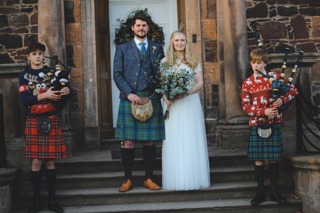 On a crisp, bright December day, MJ and Alice’s family friends and members of the school pipe band played as we all gathered under the impressively tall Christmas tree in the hall at Belhaven School, where Alice works. Alice and MJ walked up their wedding aisle together with Cora, in a symbolic gesture of the equality of their partnership and their shared love and support.