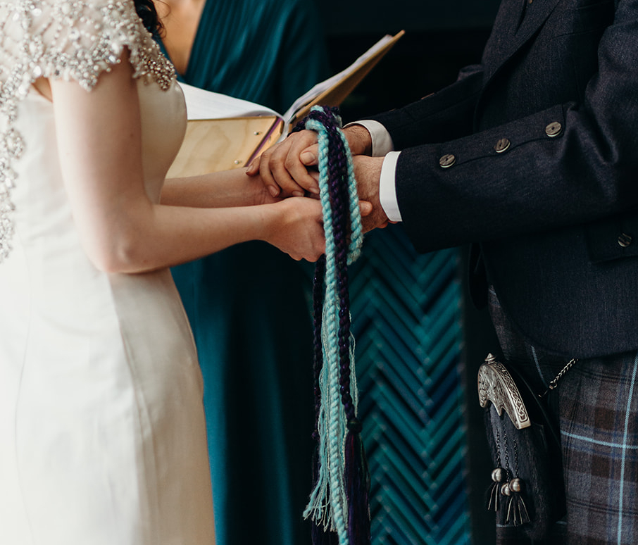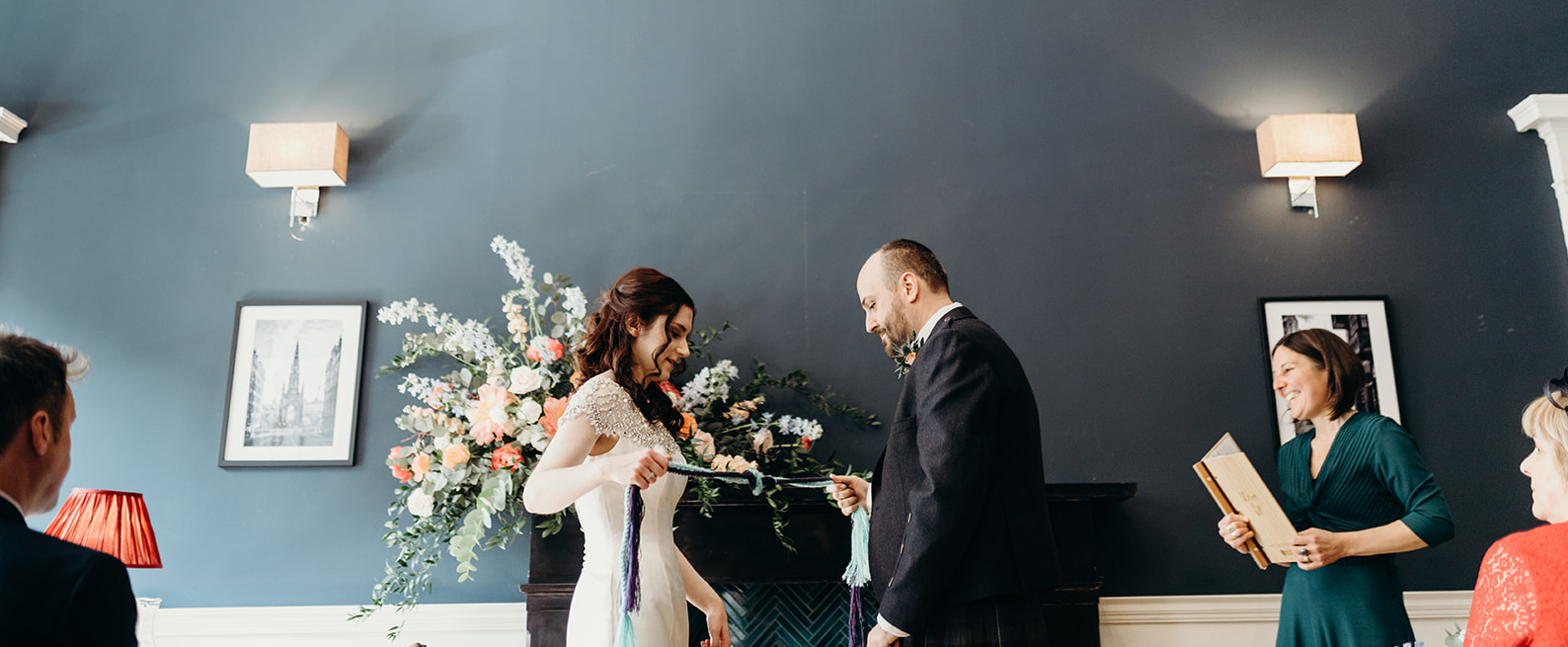They made their Marriage Vows to each other with a traditional Handfasting with two woven cords that held important symbolism for them both. The purple cord representing the Highlands where Laura grew up and a special place for them both. The teal cord presenting their love of holidaying by the sea.