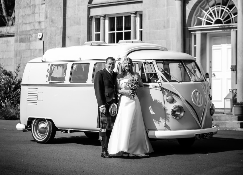 To close their ceremony, Karen and Kenny jumped together over their birch besom into their married life and the promise of all that is to come; a shared future where they will write the stories of their lives together. Then they enjoyed some fizz in this excellent VW van before celebrating with their family and friends.