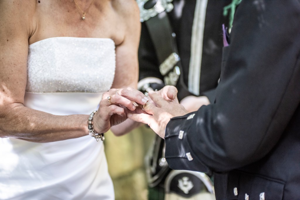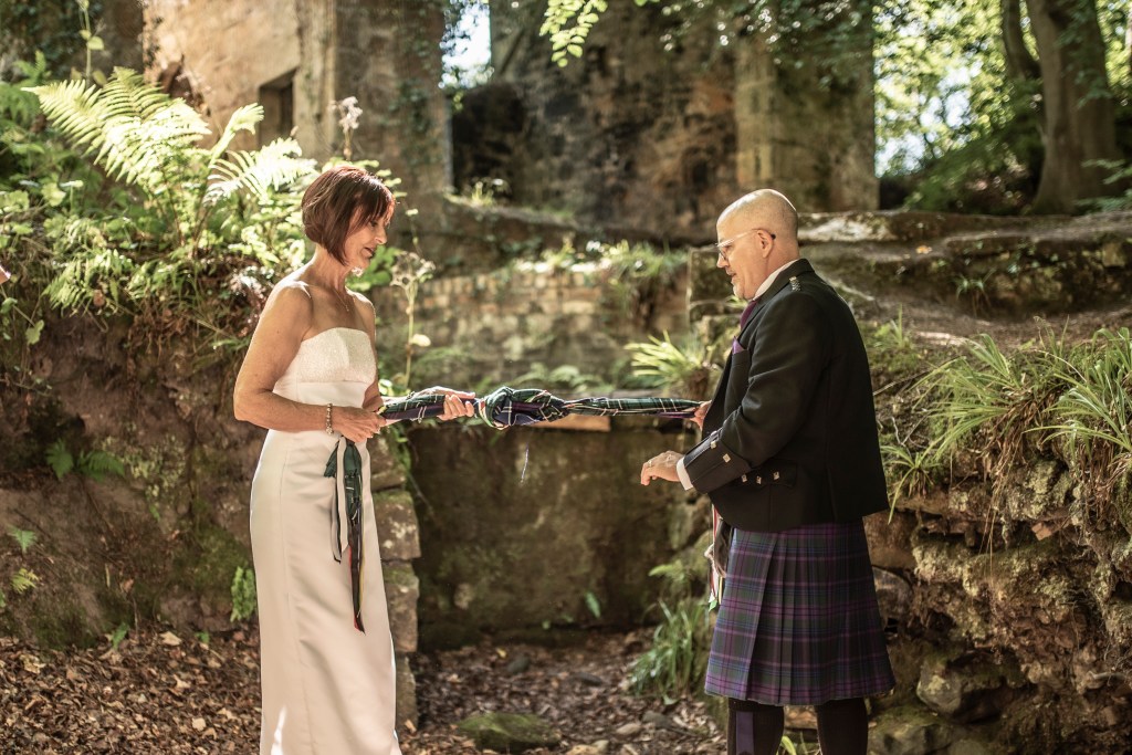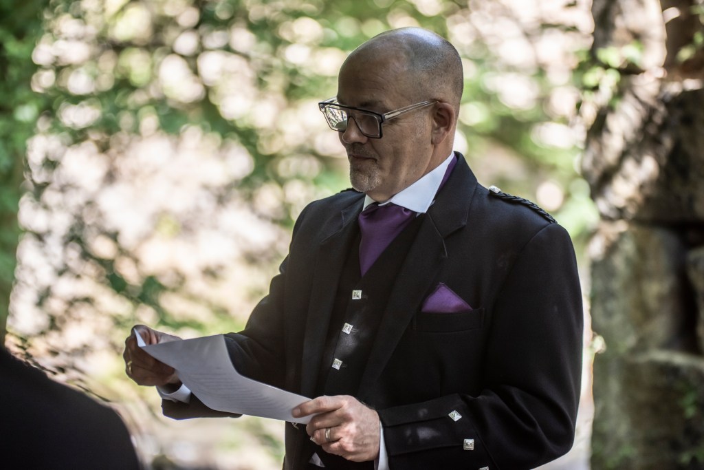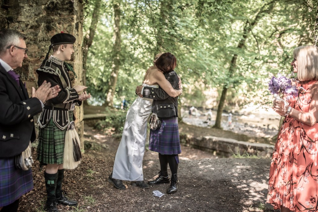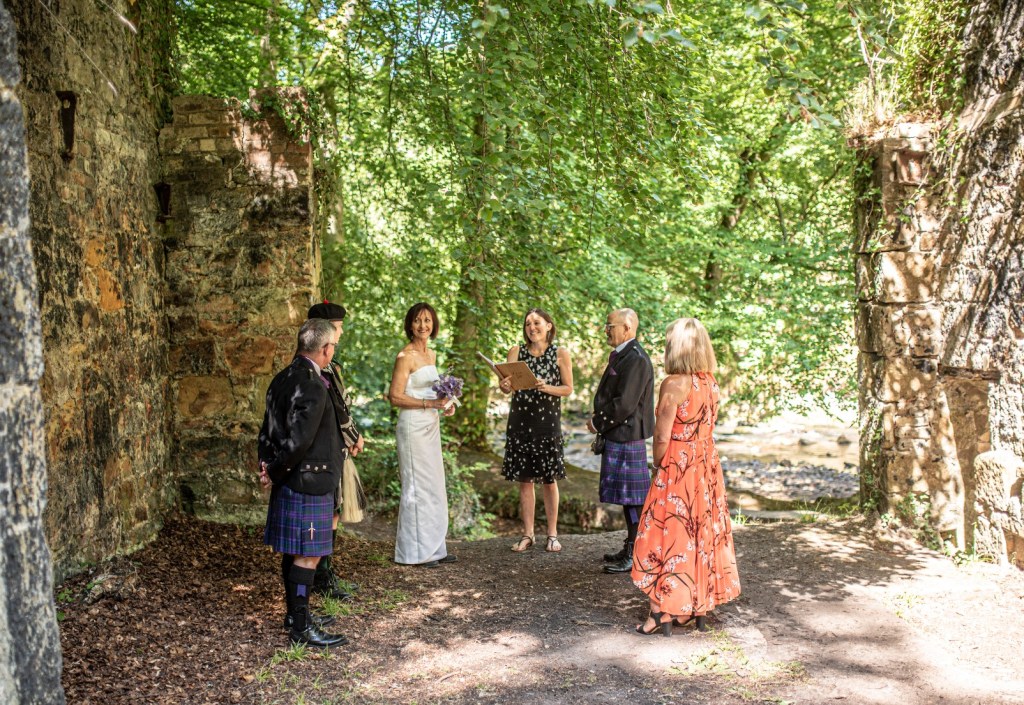 It was my honour to declare Anita and Adrian life partners to the joyful cheers of their son and friends. Then they celebrated with a shared drink from the Quaich in a sunny spot encircled by the river before cracking open the fizz.