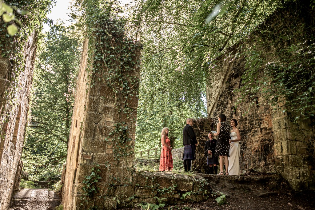 The woods were alive with birdsong and dappled sunlight on the day Anita and Adrian reaffirmed their love for one another in the heart of Roslin Glen in the North Esk Valley.