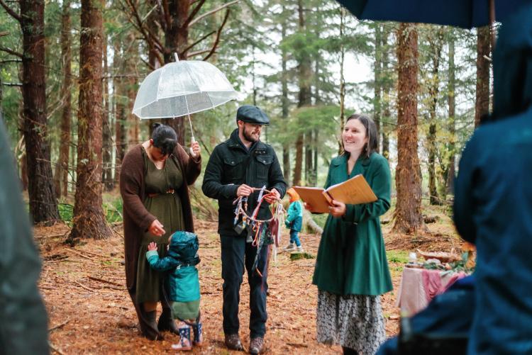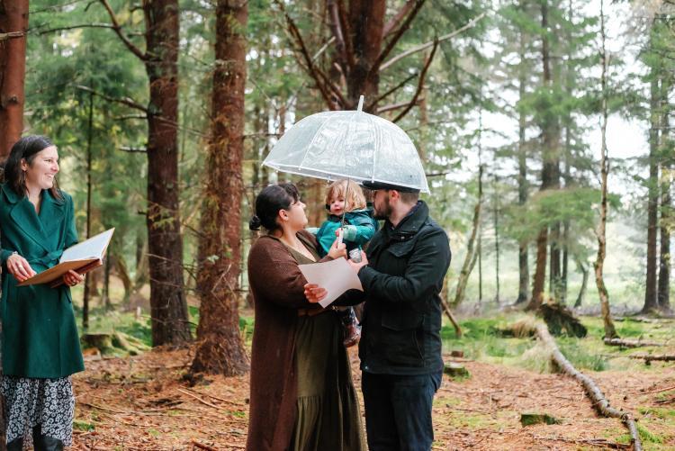 We gathered beneath the shelter of the pines in Abernethy Forest as Storm Babet swept across Scotland. Wren’s welcome to the world and naming ceremony was possibly the rainiest ceremony I’ve had the honour to lead in all my years of celebranting. The rain only added to the fun for this small but mighty little one as she splashed about us in her wellie boots and rainsuit, enjoying the puddles.