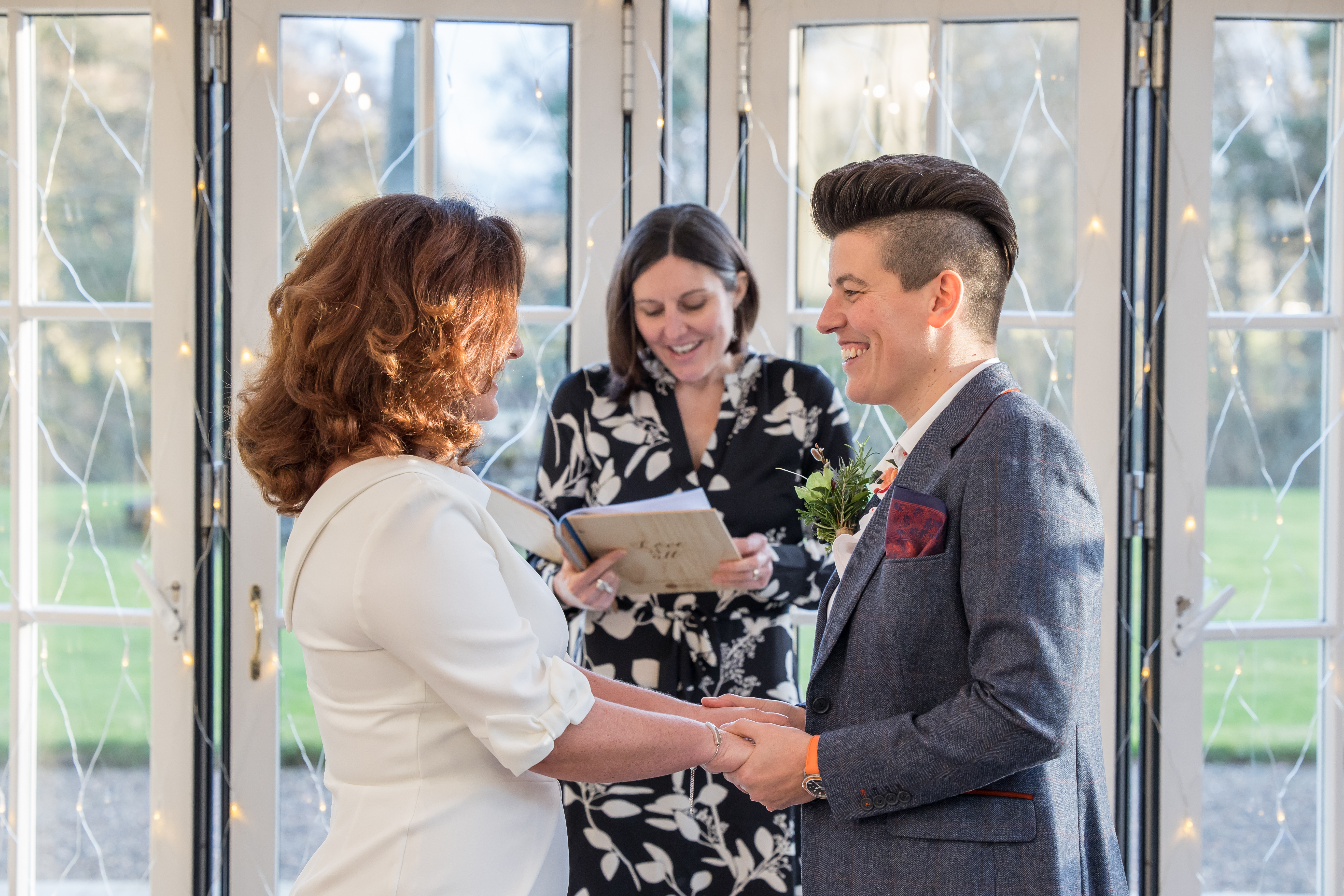 We started with some beautiful words that Chris and Kim’s further afield friends had shared with me in secret when planning the ceremony. This helped put them both at ease as we all laughed and shed happy tears at their funny, insightful thoughts. Not least, how it was clear that Chris was a keeper, after two close friends of Kim’s had seen his ability over the festive season to handle single malt and oversized Christmas trees!