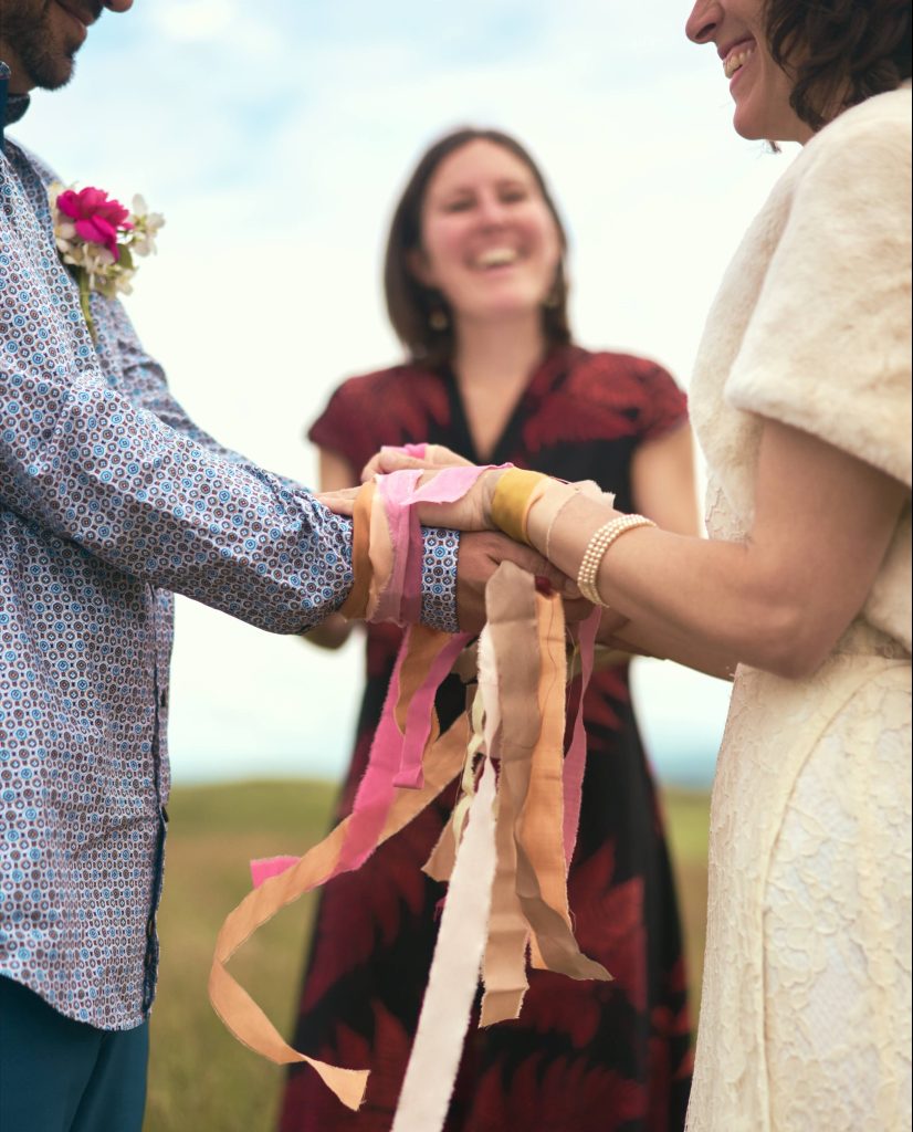 It is up to you when you choose to include a Handfasting ritual in your ceremony. For some, the tying of the knot becomes an intention-setting declaration at the start of the ceremony, gathering loved ones into the space. Each person is invited to gift a ribbon with symbolic qualities or elements that you might wish to weave into your vows. This is also a lovely way to involve children.