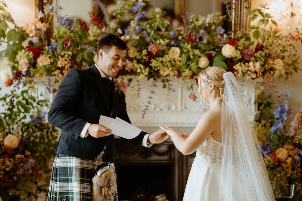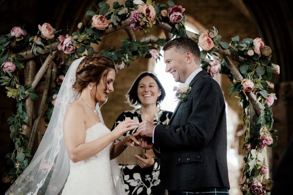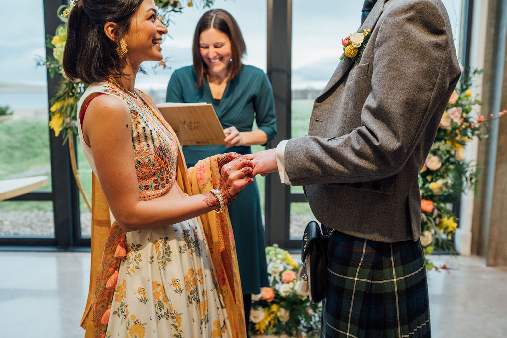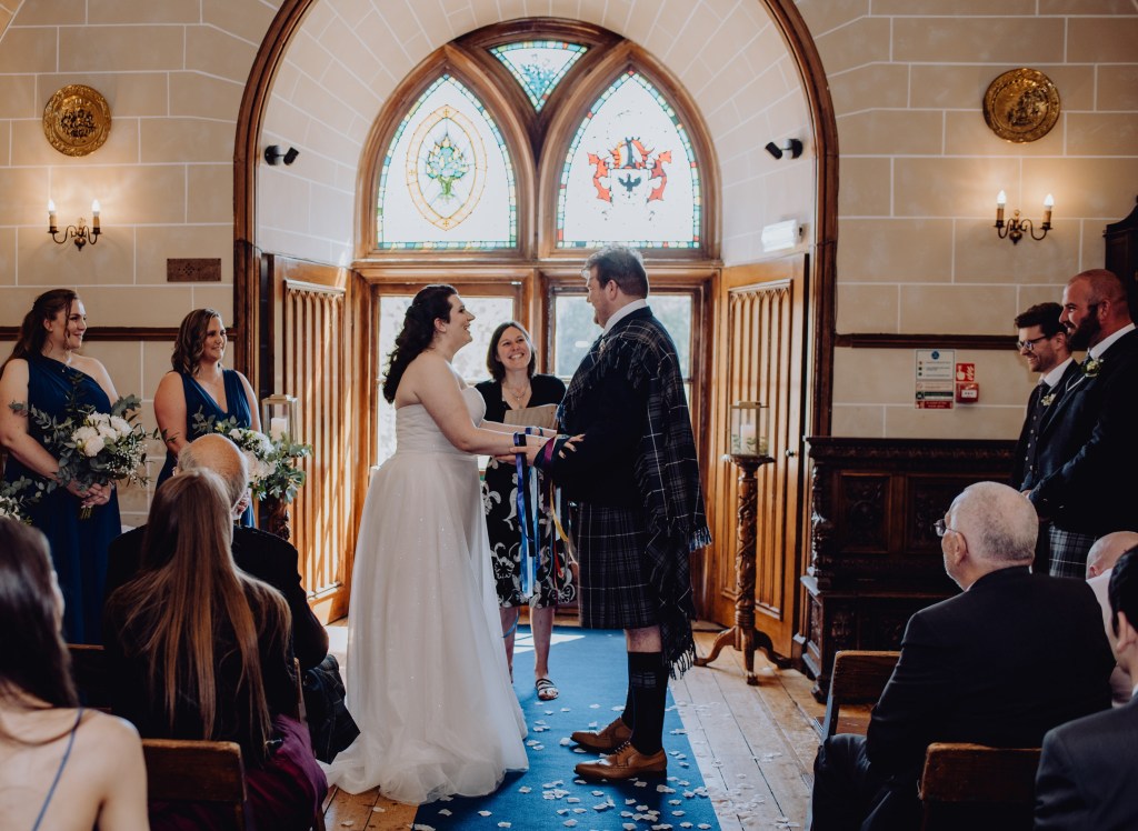 “Onie wrote the most beautiful ceremony for us, the words spoken will be cherished forever, a highlight of our wedding day. She is a born storyteller with a calm and nurturing way. Planning (and rescheduling) our wedding during CV-19 brought about a rollercoaster of emotions, and Onie was a huge support. She kept us well informed of the Scottish guidelines and was so flexible and supportive. We loved the beautiful scrolls Onie made for our wedding vows and our gorgeous ceremony keep sake. Thank you Onie for making our day so very special, for being kind and professional, we hope to see you again real soon. Ashley & Tom”